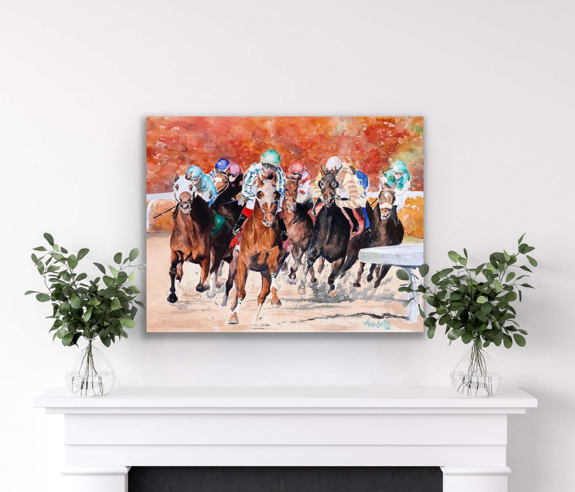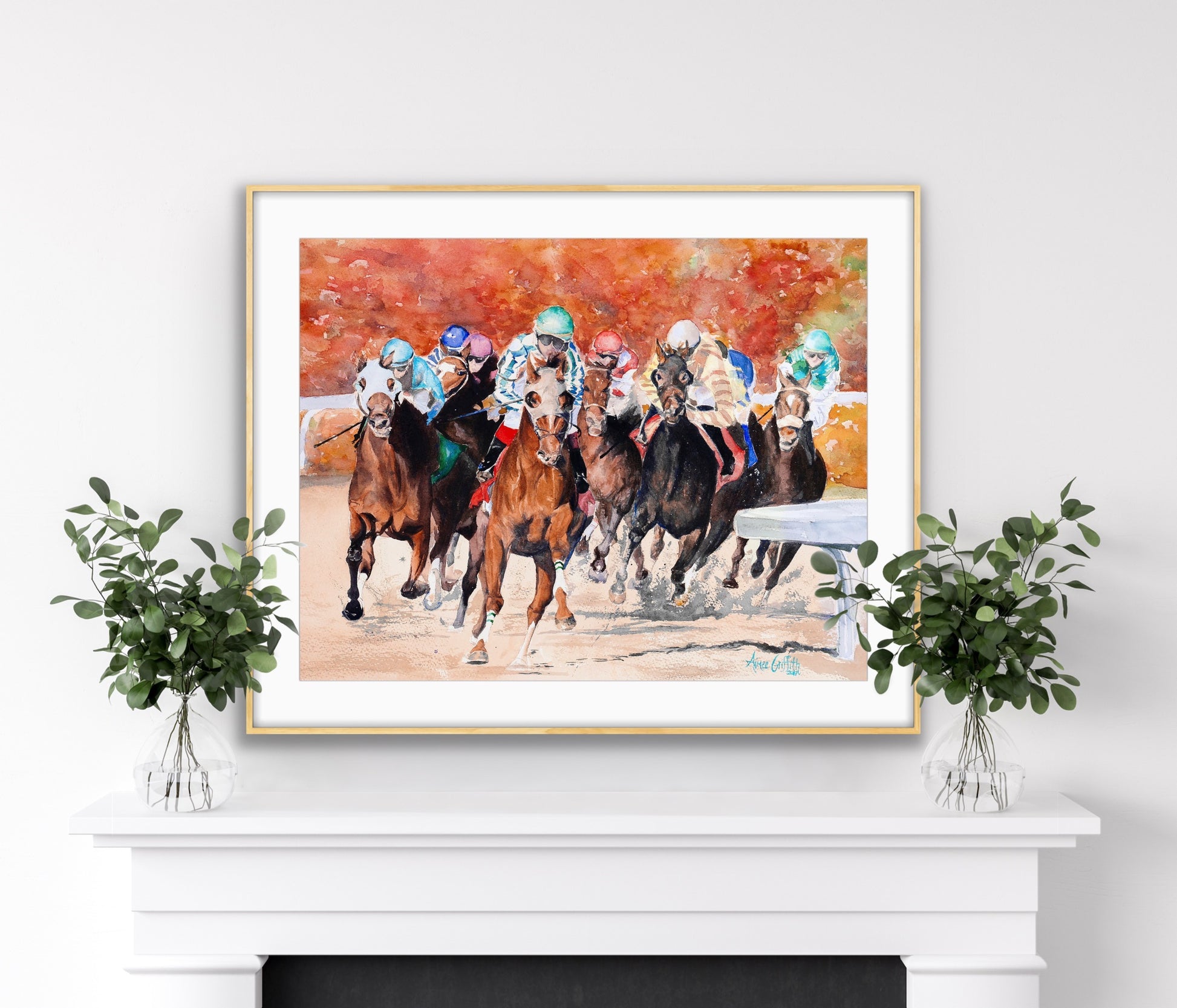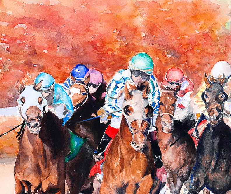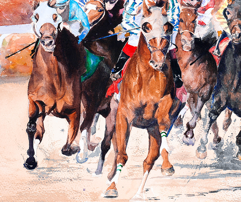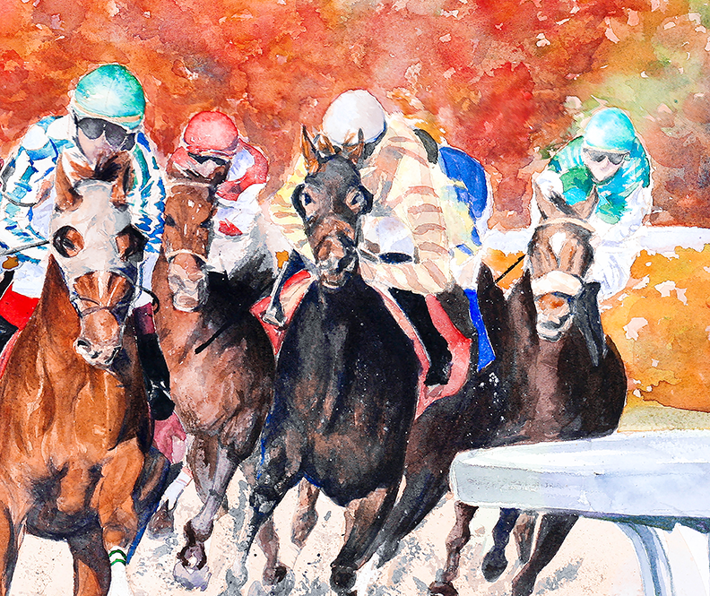 The painting captures a fleeting moment in time, freezing the excitement and energy of the horses' final sprint, forever preserving the magic of the fall meet at Keeneland in Lexington, Kentucky - the "Horse Racing Capital of the World."