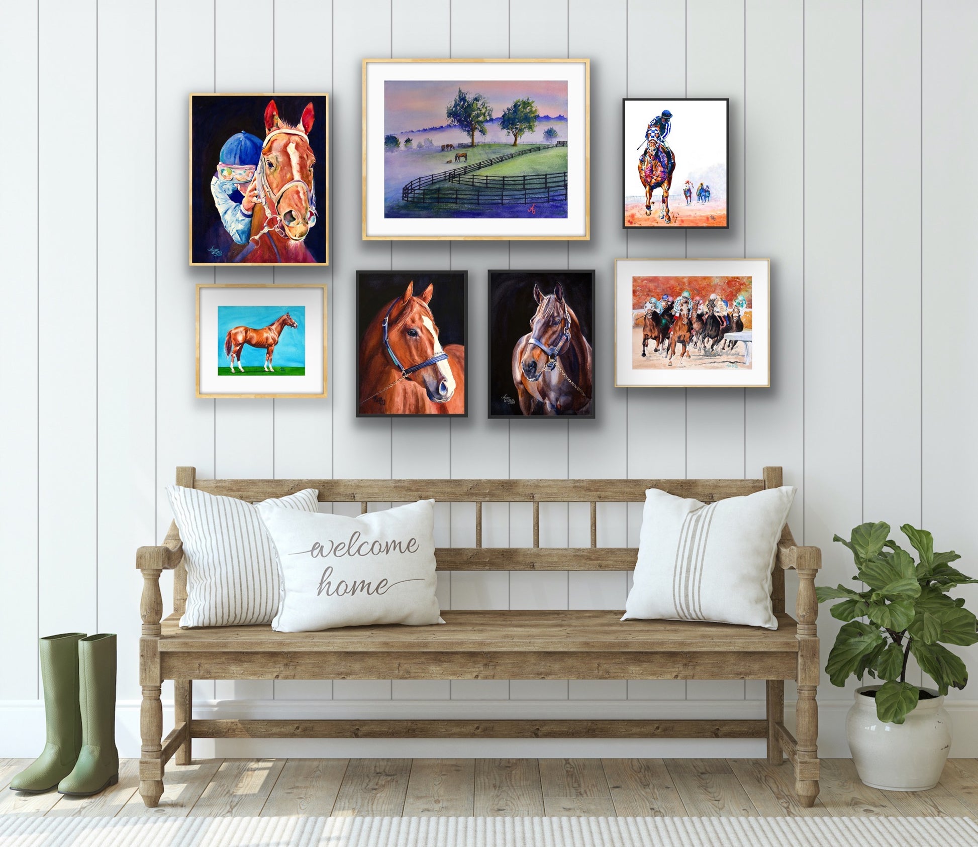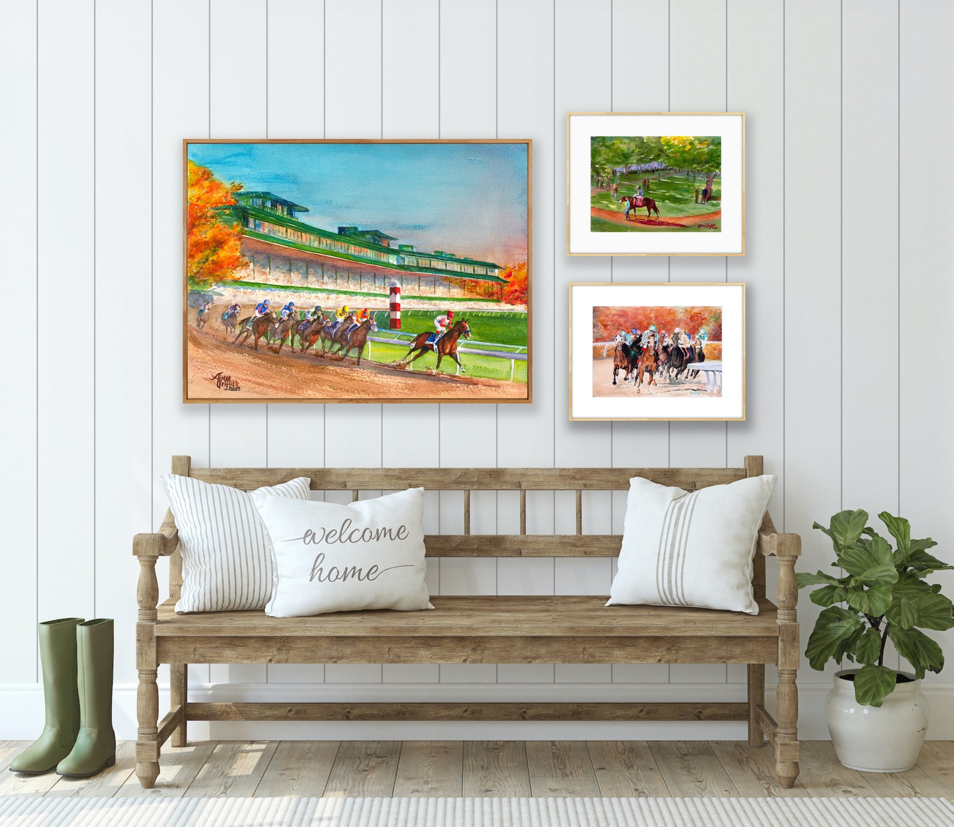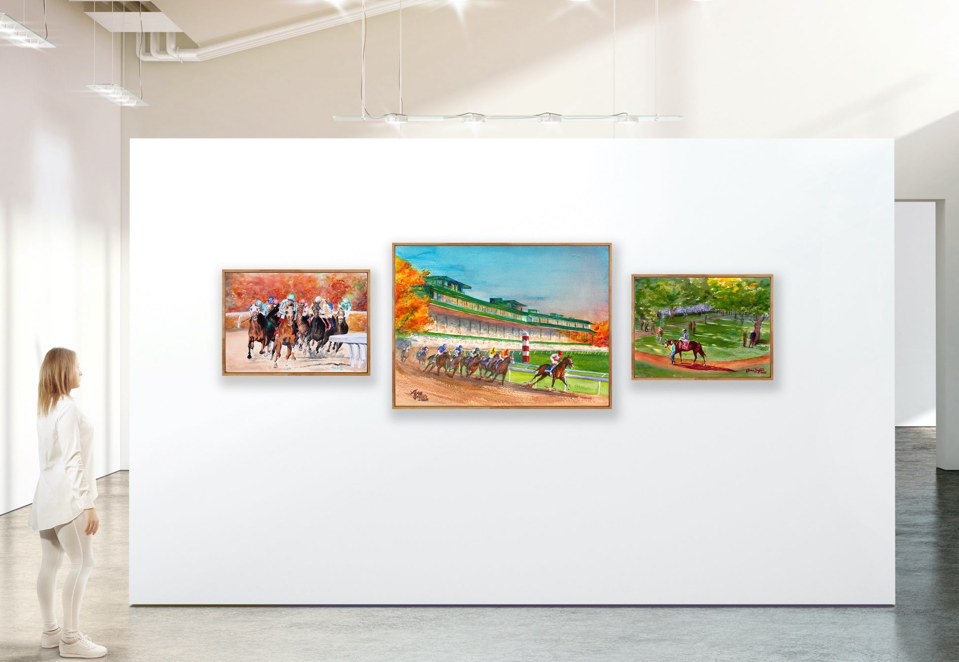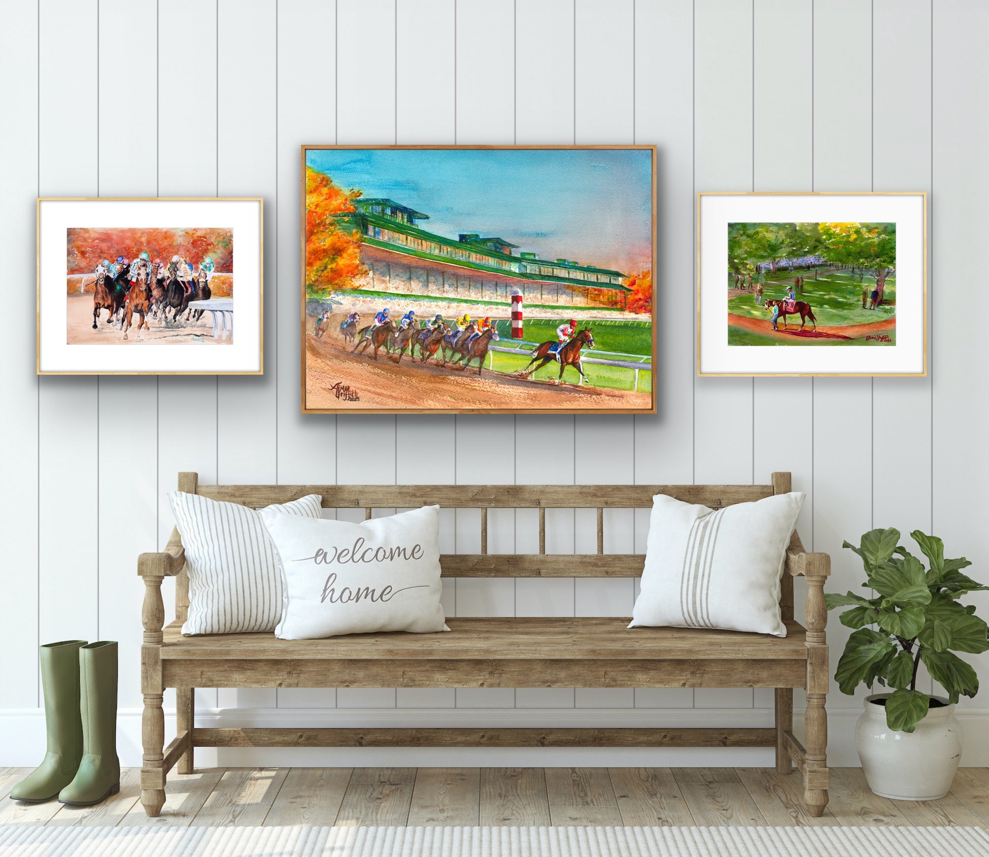 The painting captures a fleeting moment in time, freezing the excitement and energy of the horses' final sprint, forever preserving the magic of the fall meet at Keeneland in Lexington, Kentucky - the "Horse Racing Capital of the World."