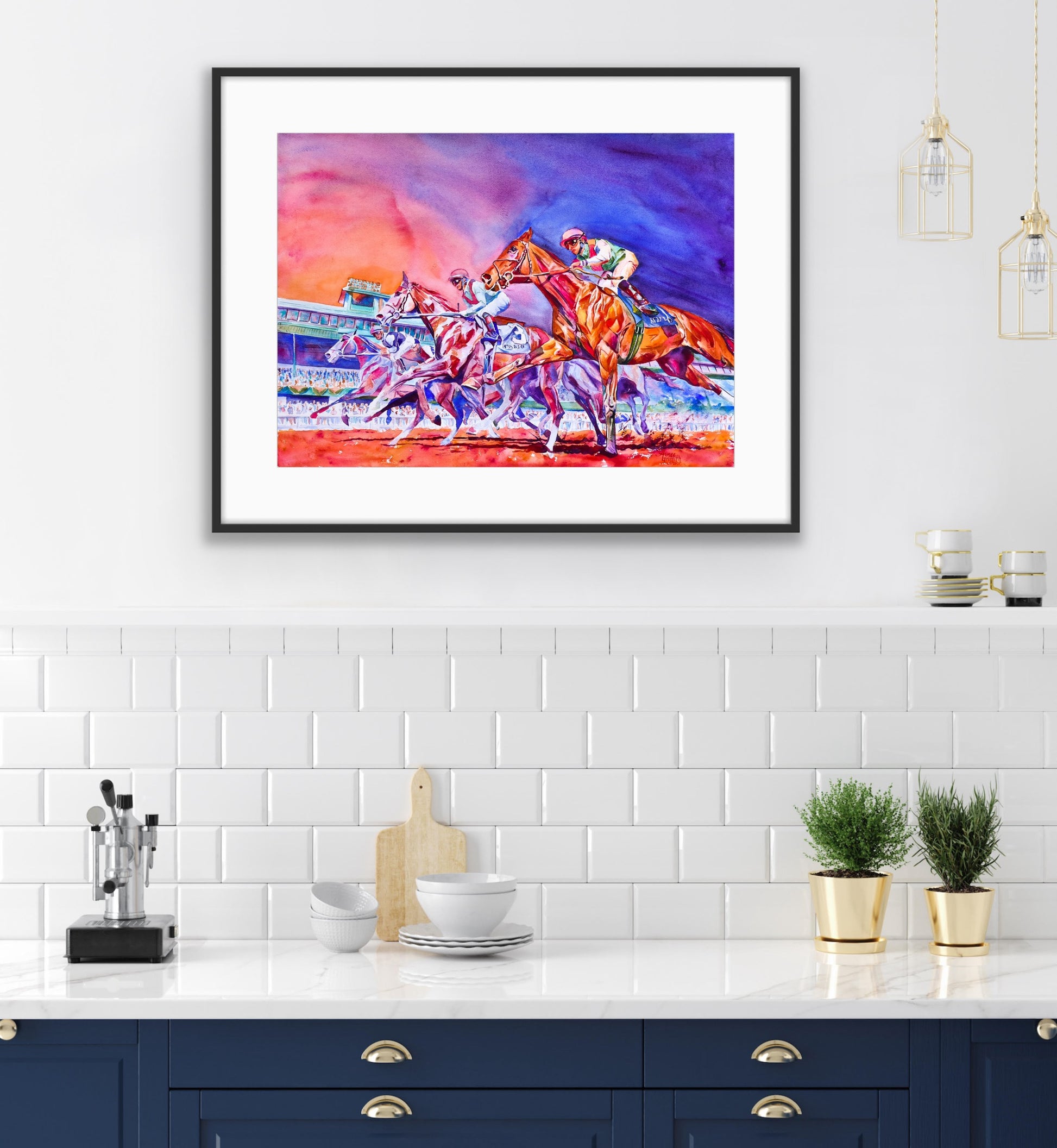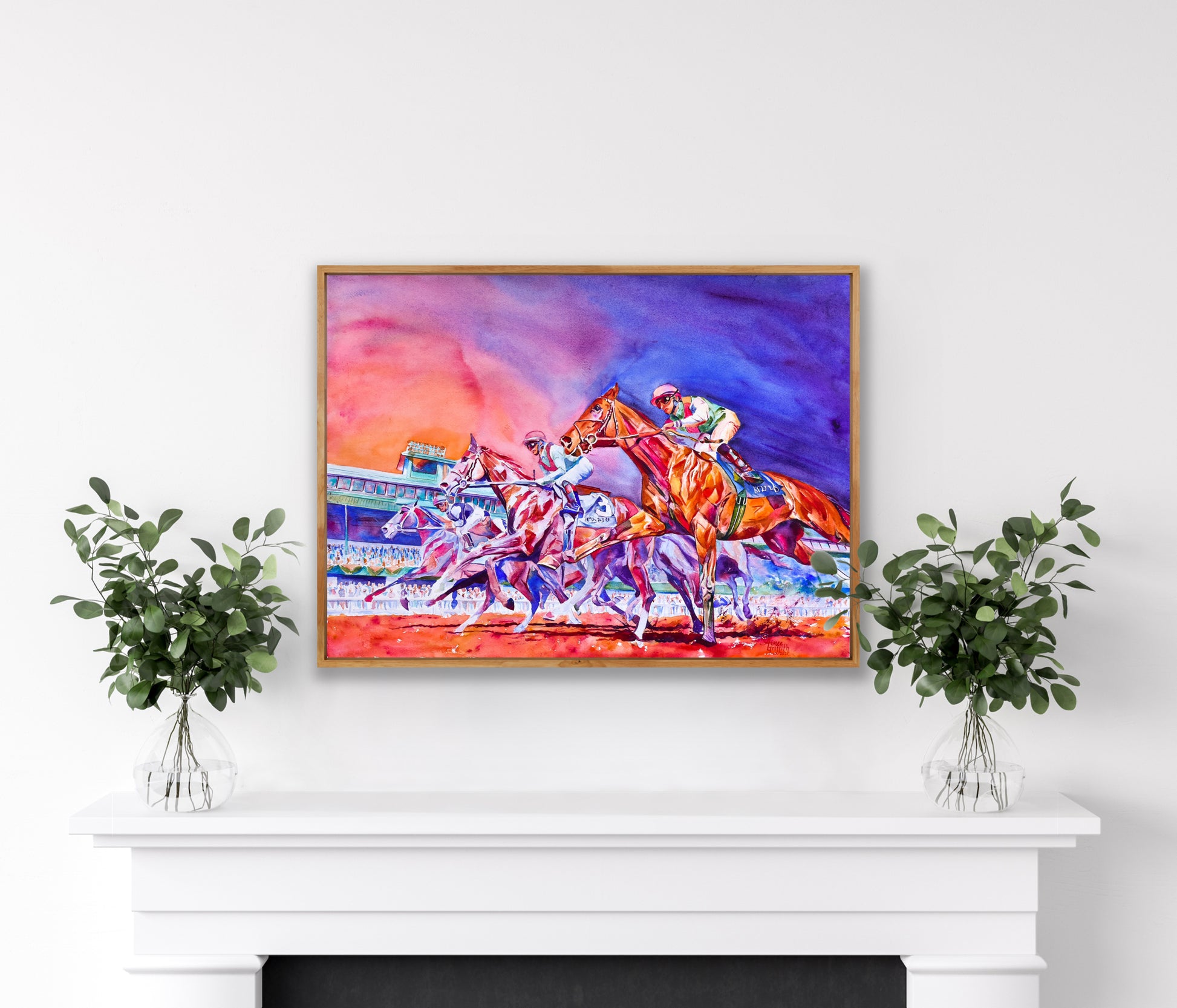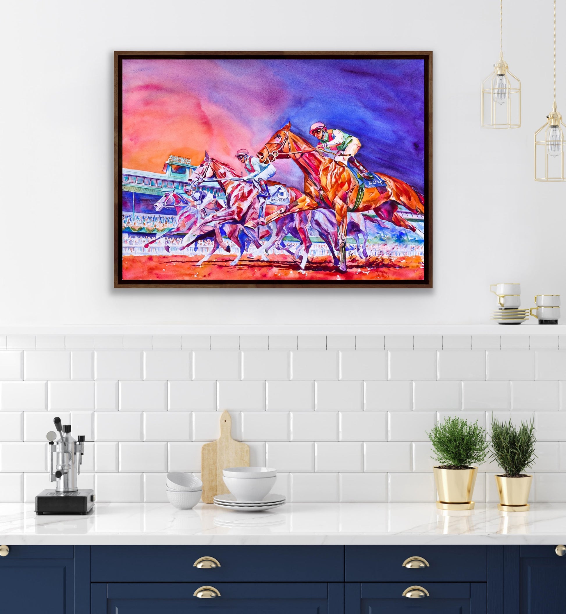Bright, bold and vibrant… this is Keeneland presented in a contemporary style. This is a professional quality giclee print of an original watercolor painting of horses approaching the finish line at the iconic Keeneland Race Track in Lexington, KY.