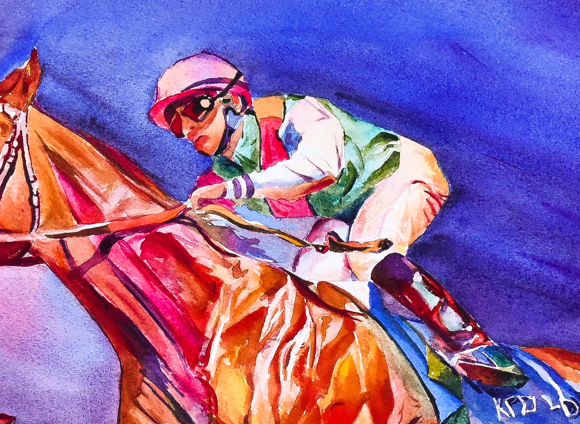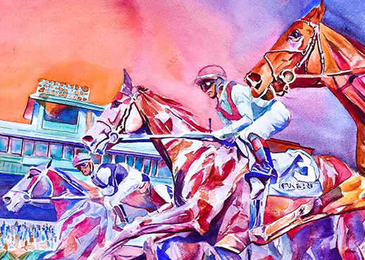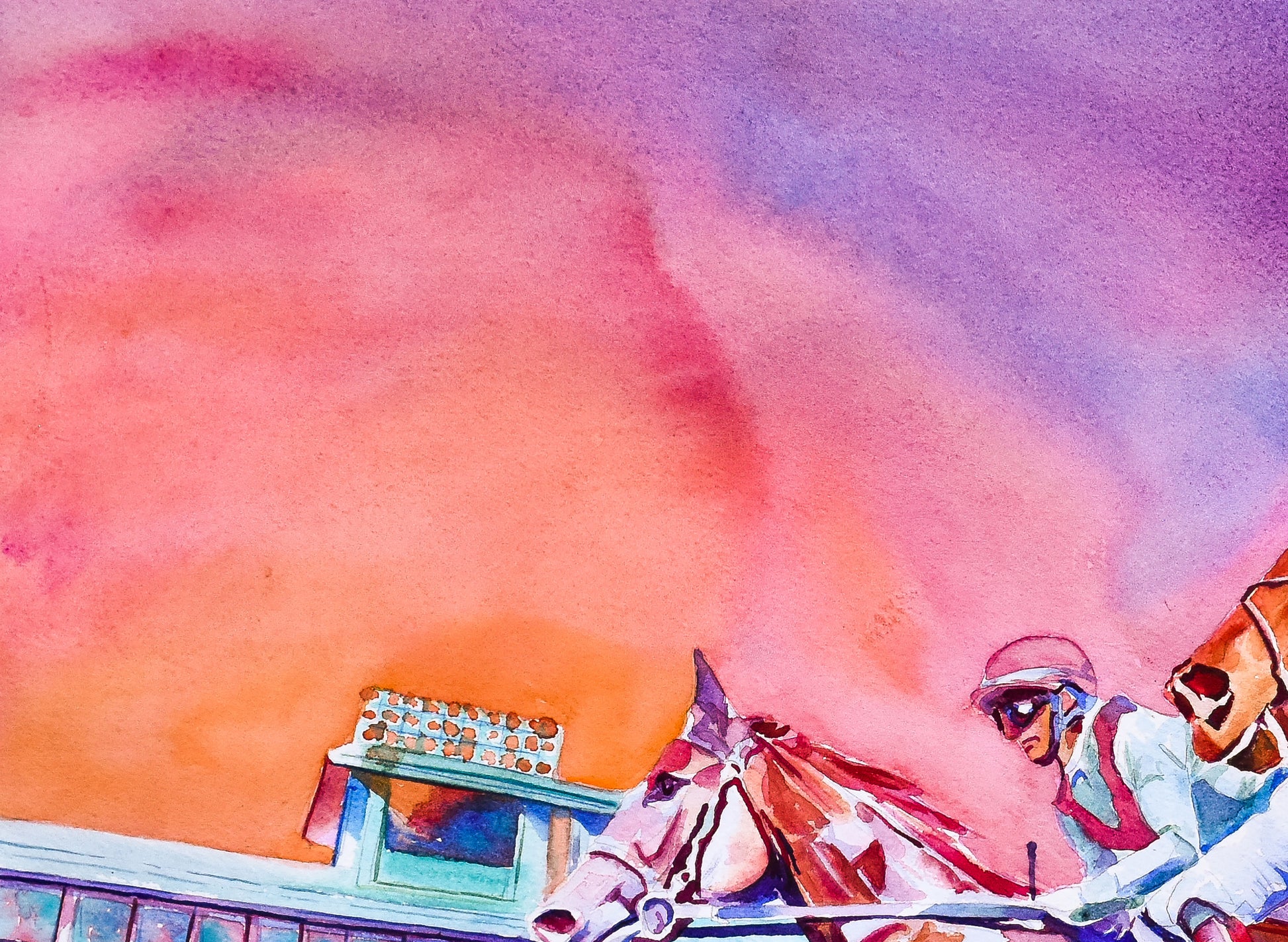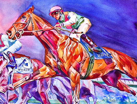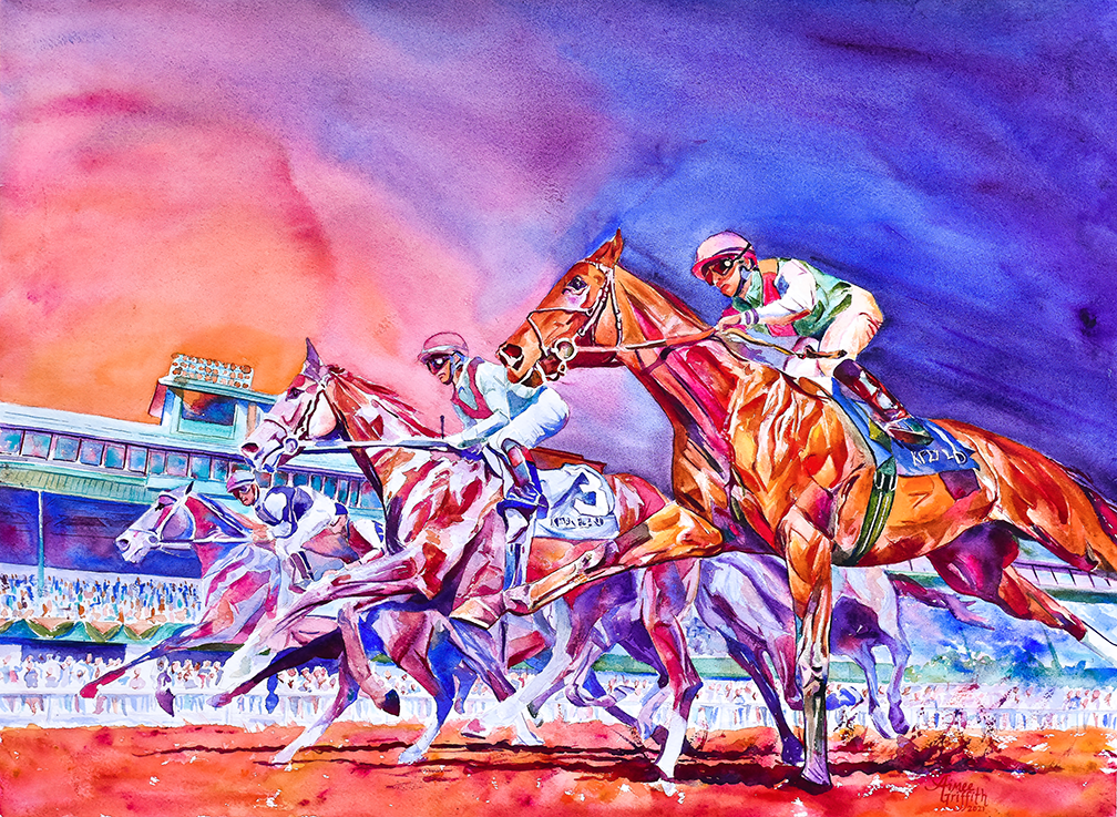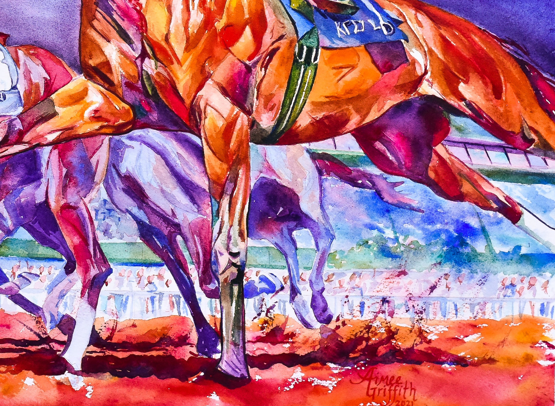 Bright, bold and vibrant… this is Keeneland presented in a contemporary style. This is a professional quality giclee print of an original watercolor painting of horses approaching the finish line at the iconic Keeneland Race Track in Lexington, KY.