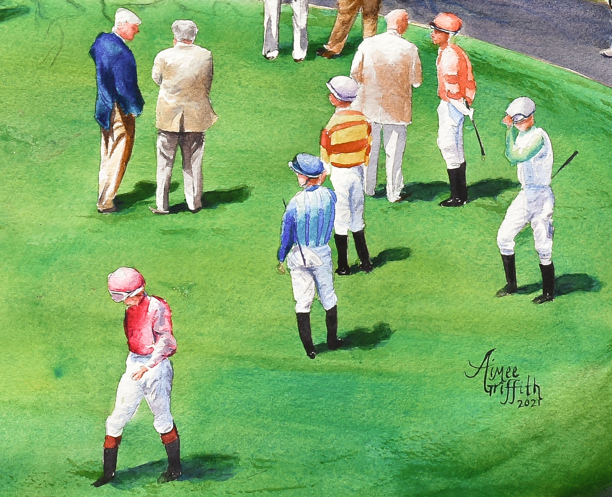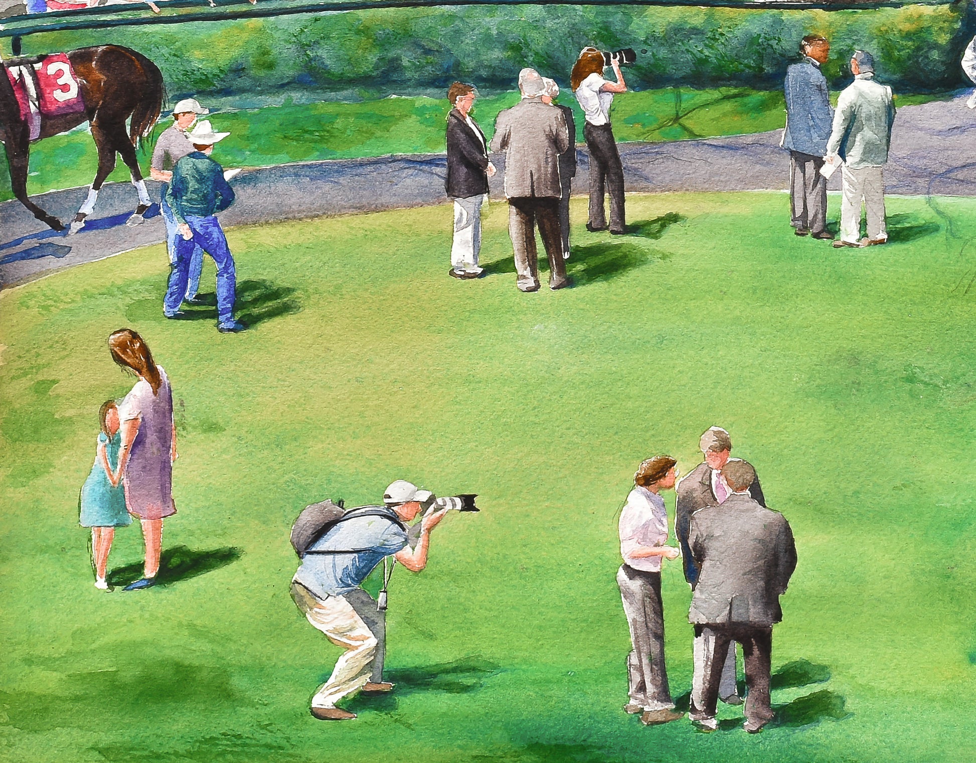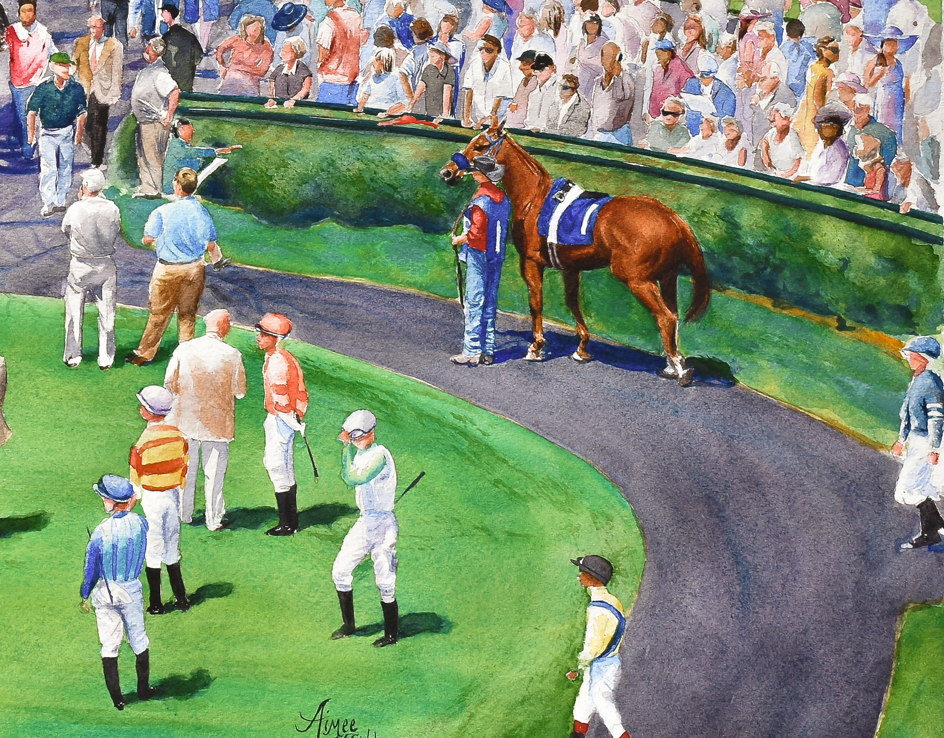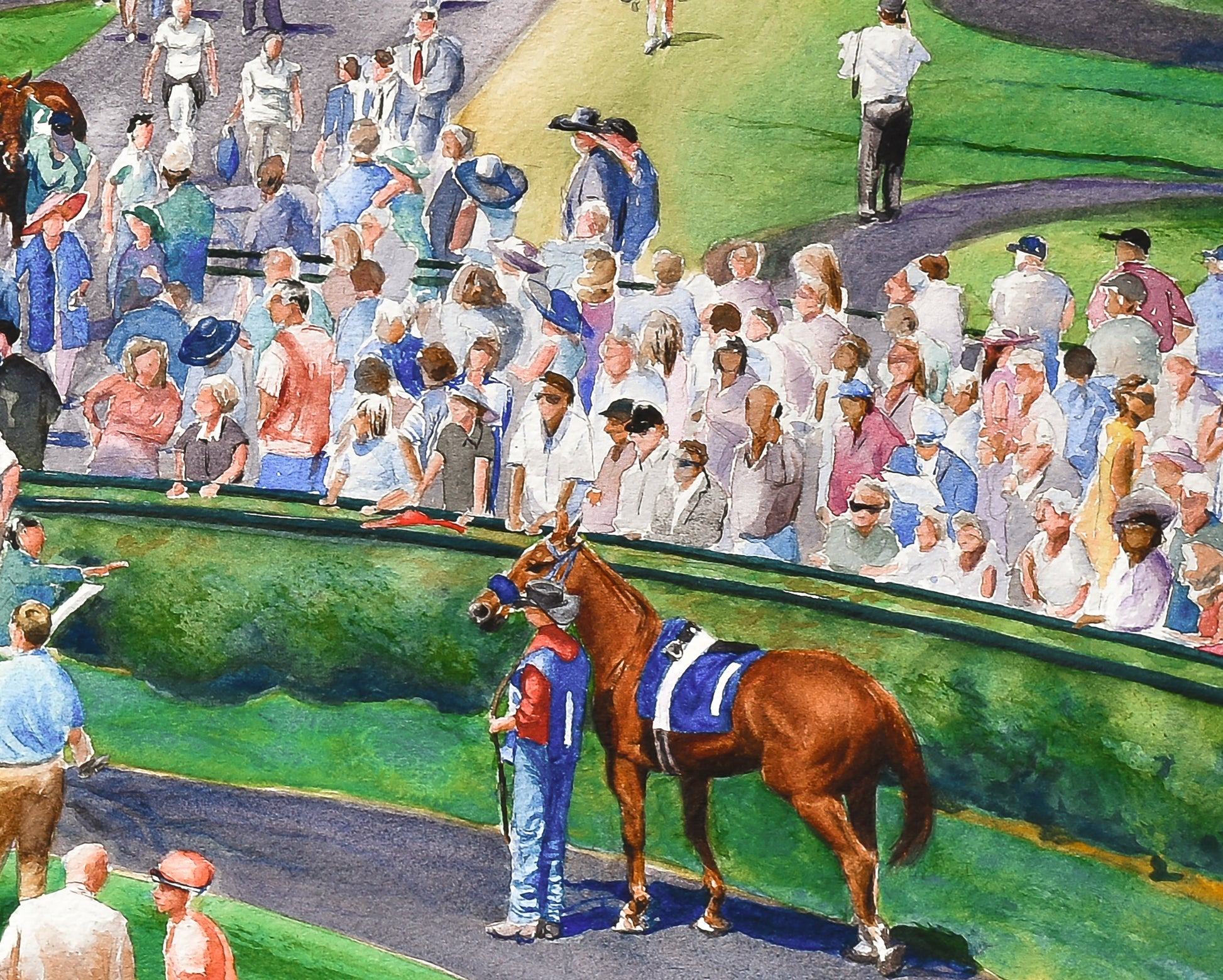 As you gaze upon this artwork, you can almost feel the atmosphere of anticipation. The meticulous attention to detail in every stroke of the watercolor brush showcases the artist's passion for capturing the spirit of Keeneland.