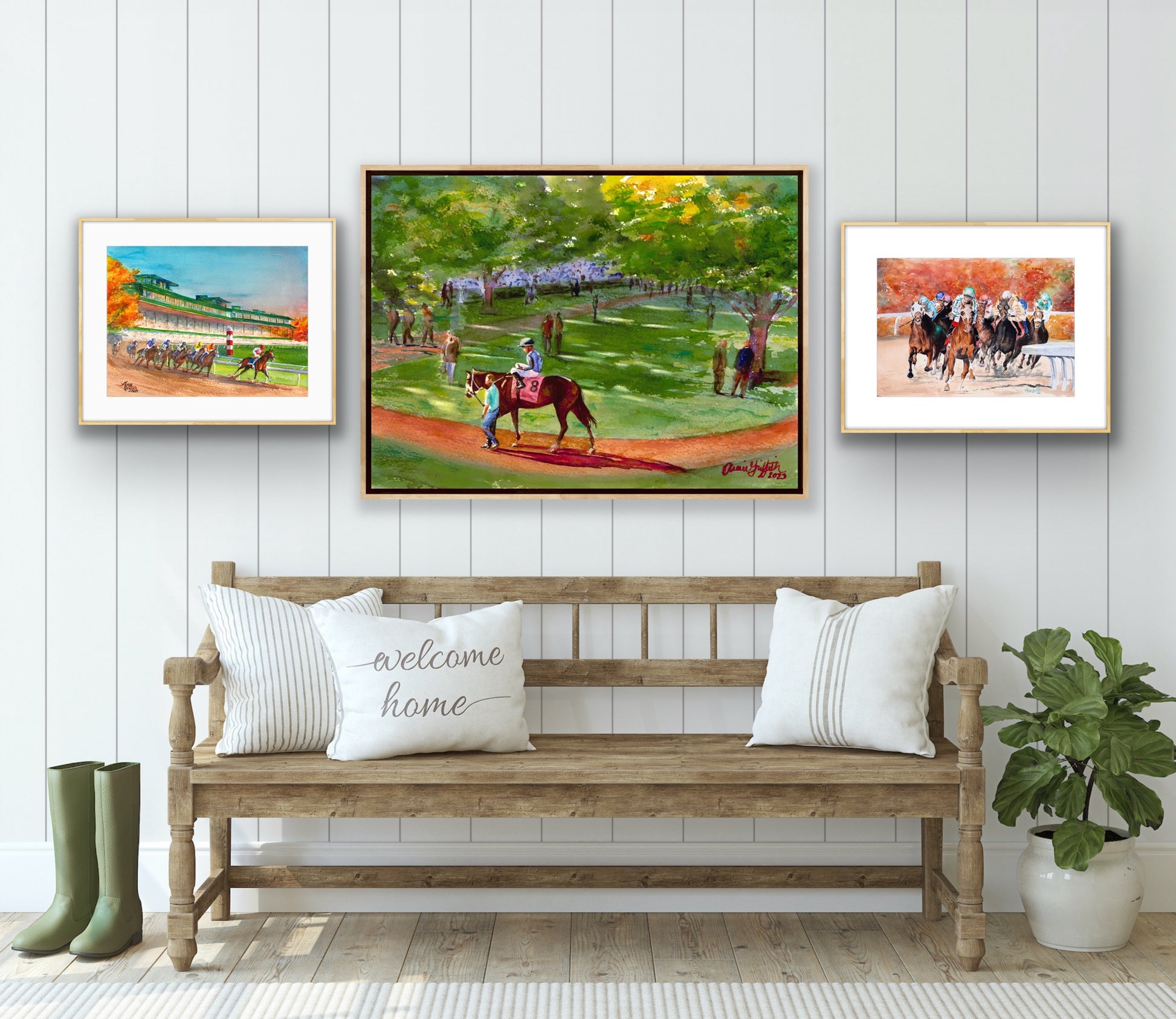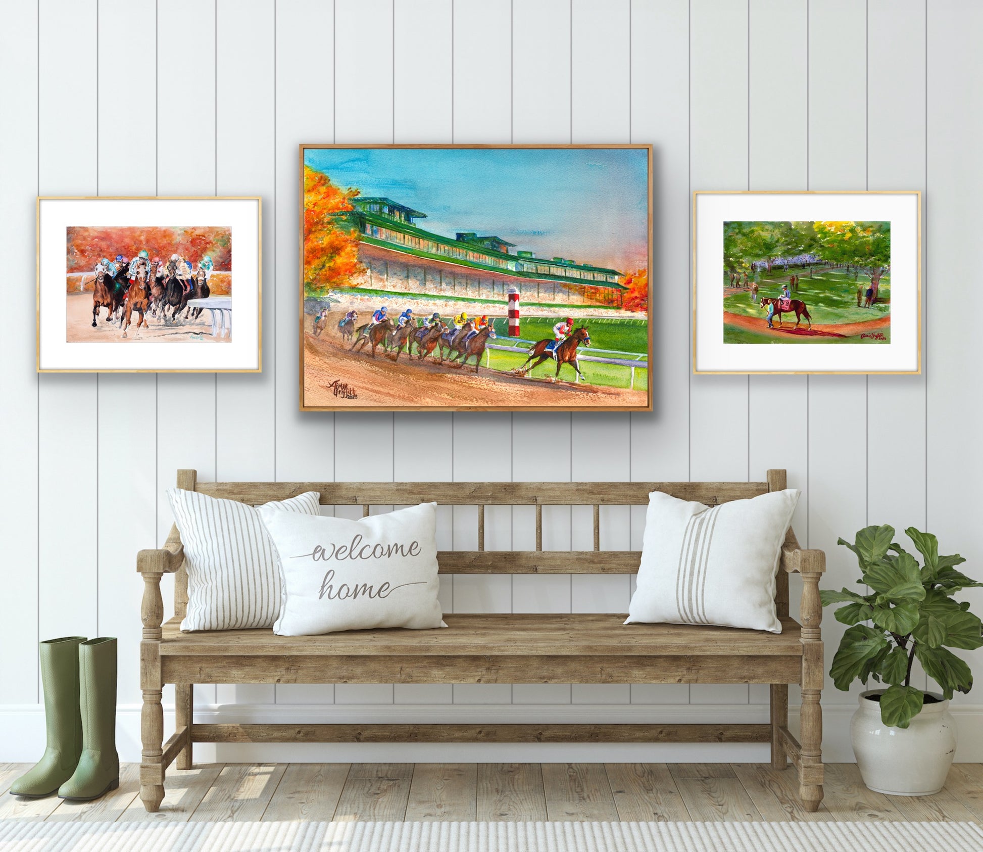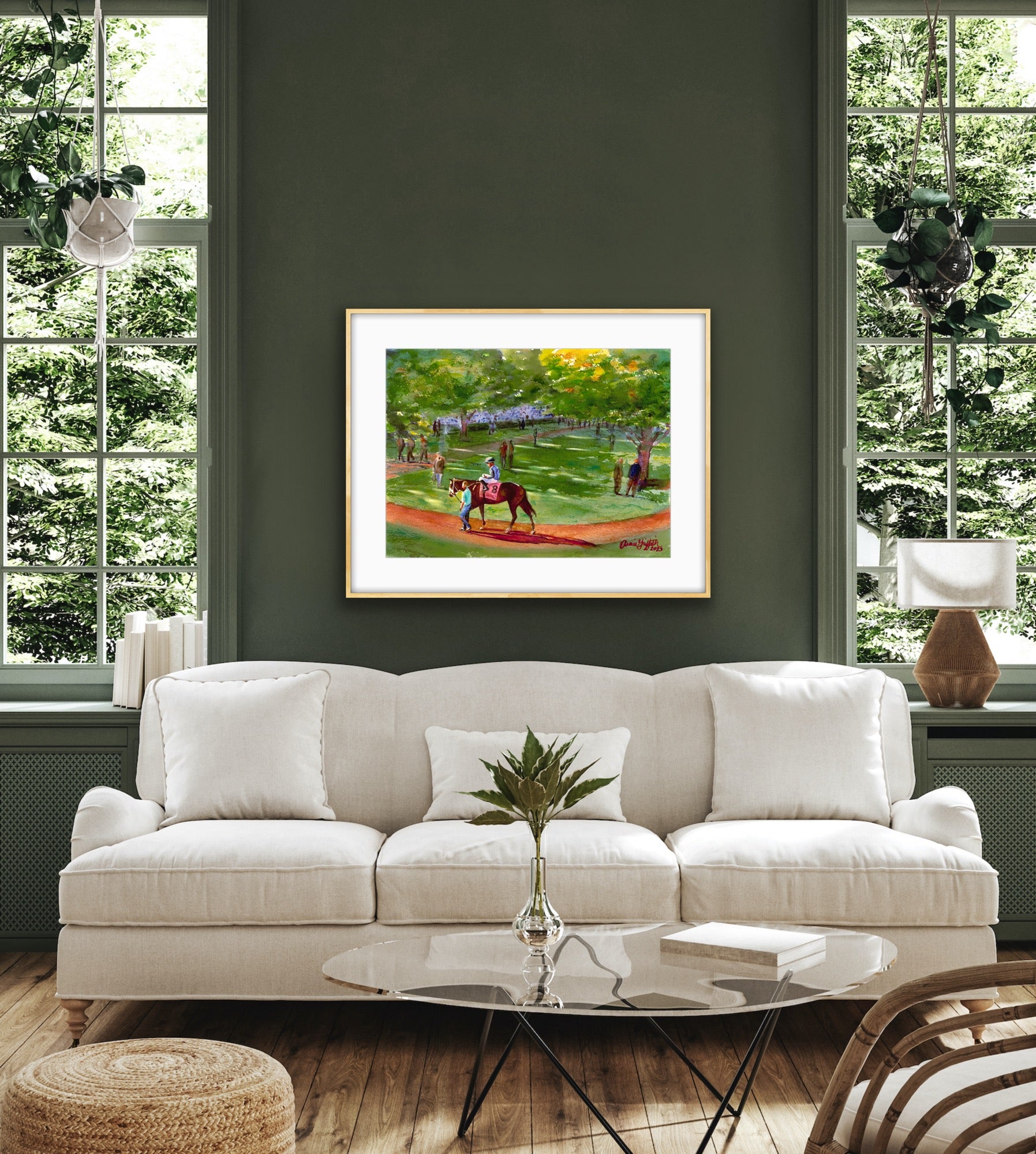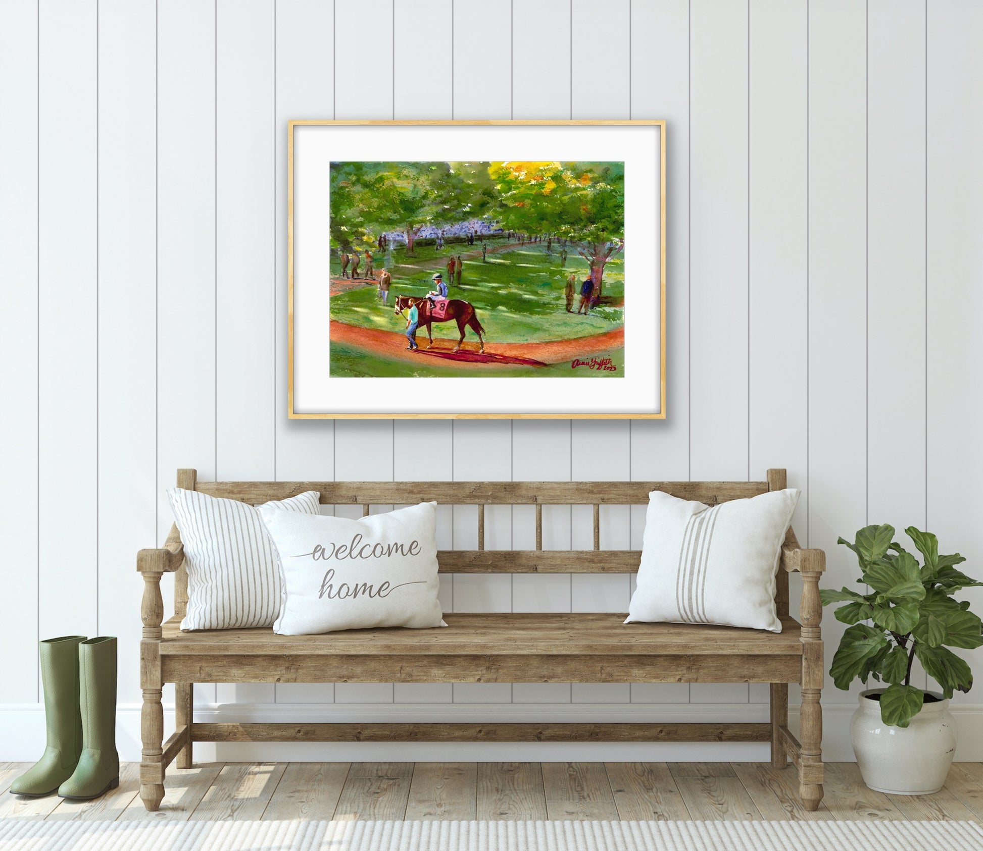 This is a professional quality giclee print of original watercolor painting of the horses and jockeys making last minute preparations, getting ready to walk onto the Keeneland racetrack in Lexington, KY during the most beautiful season in Kentucky, autumn.
