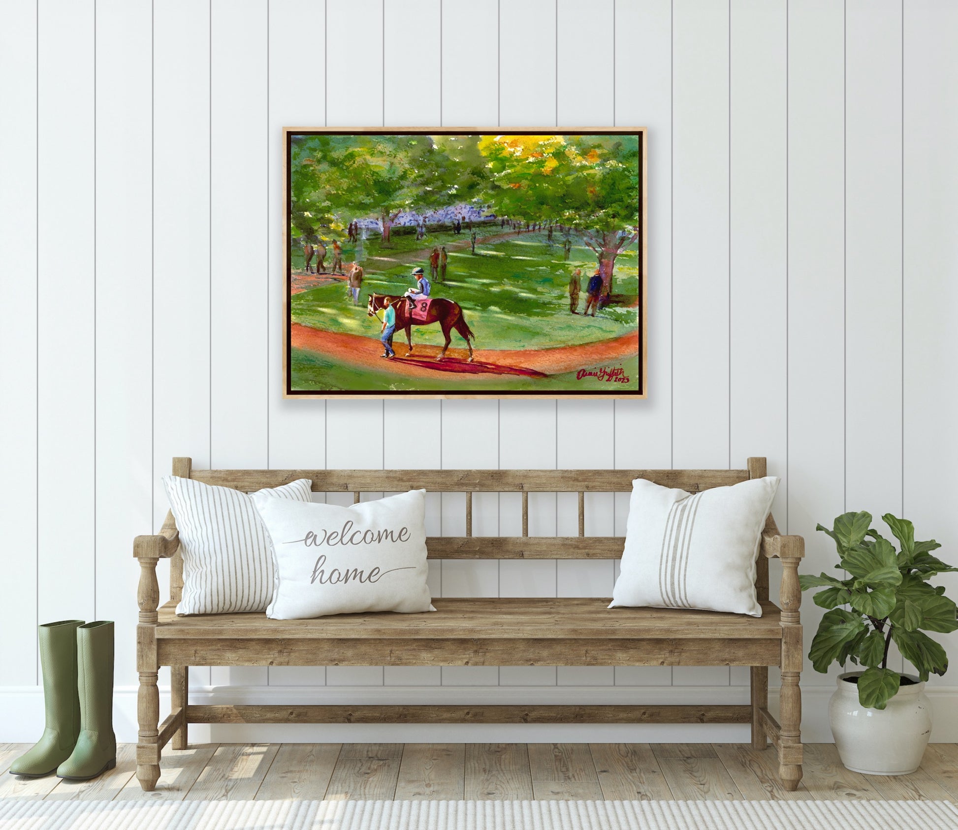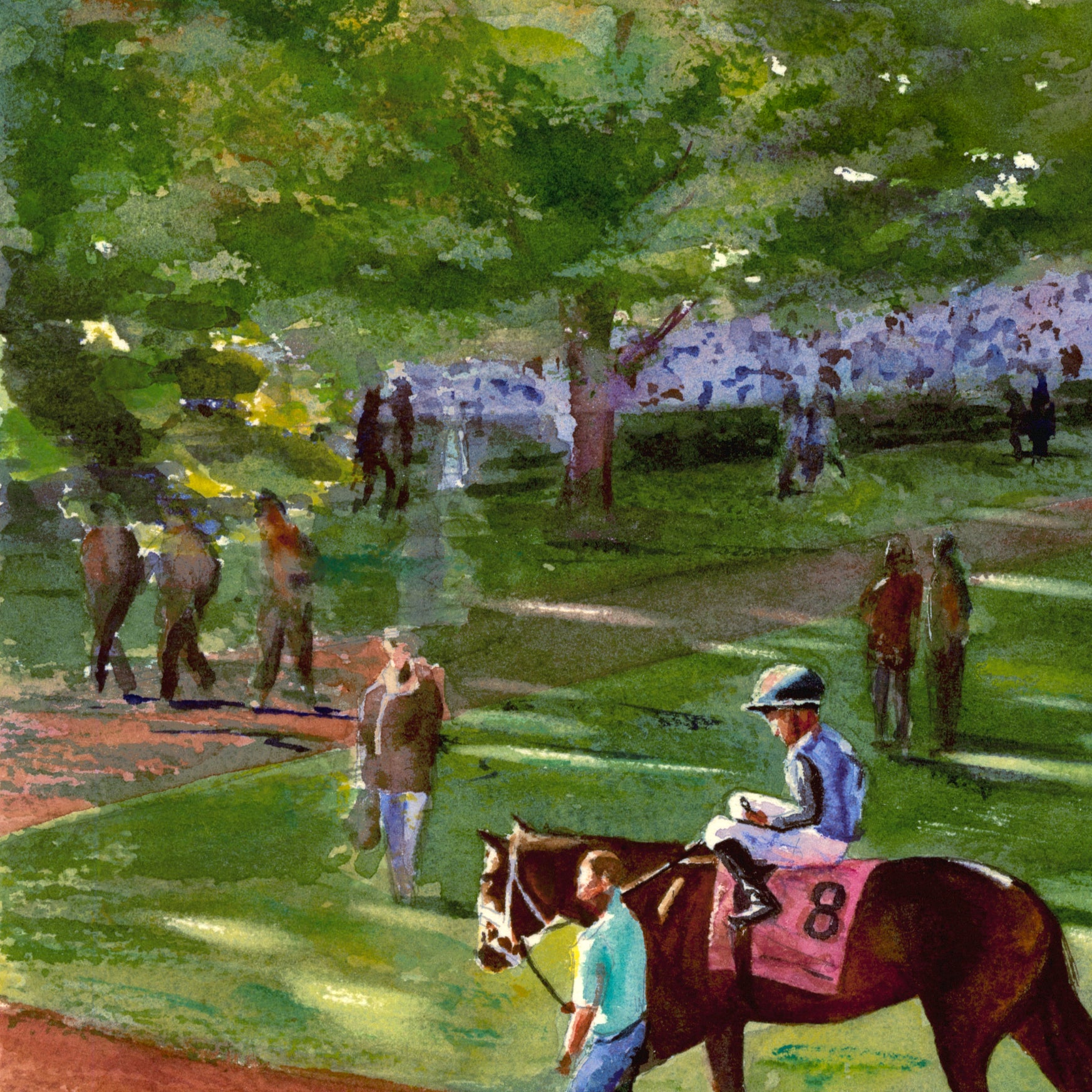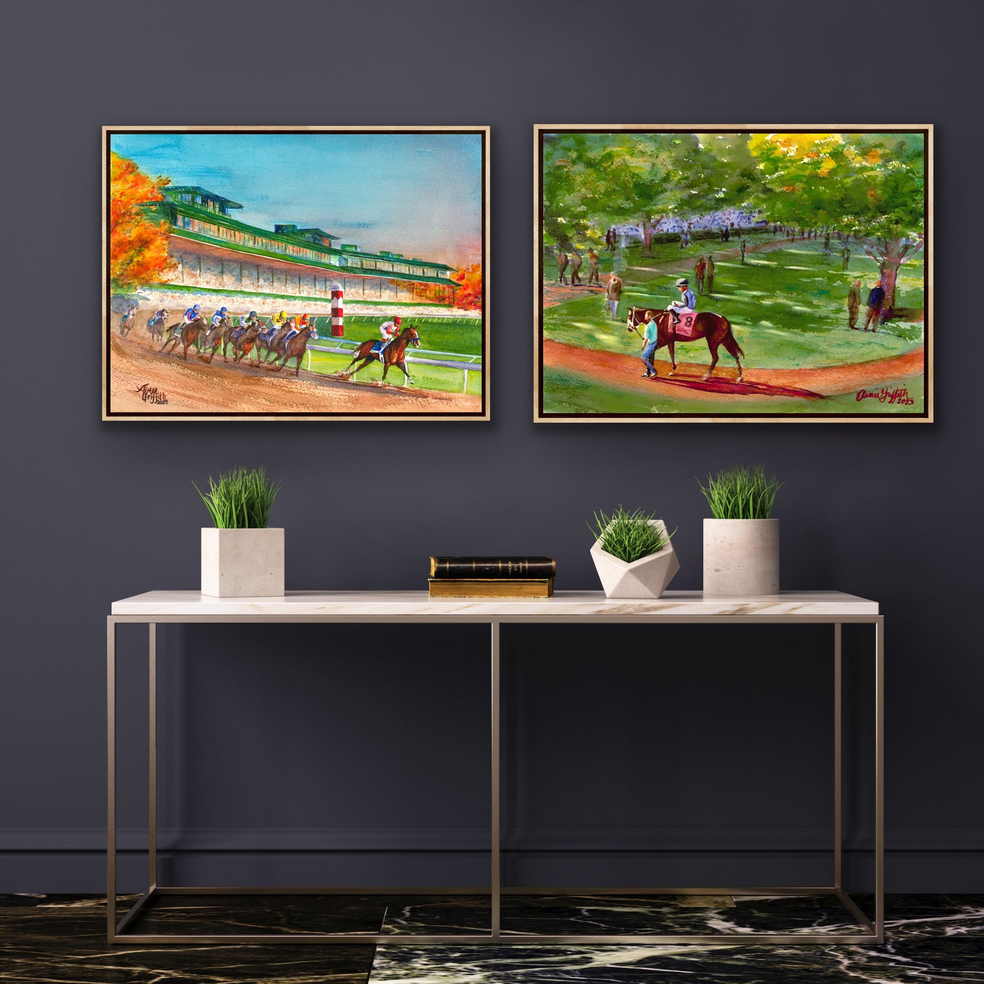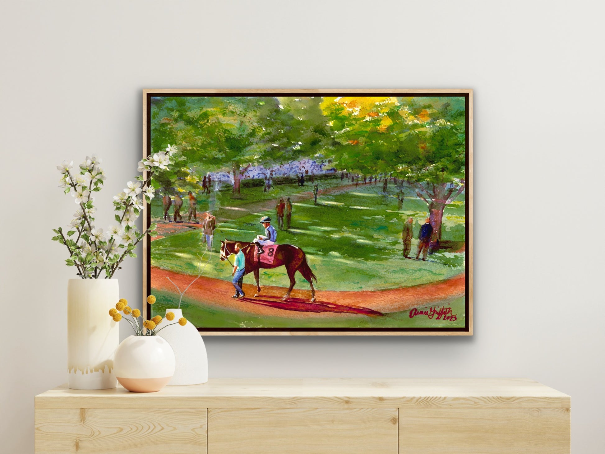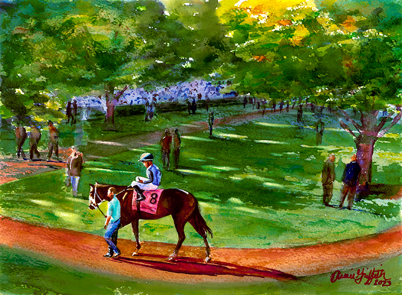 This is a professional quality giclee print of original watercolor painting of the horses and jockeys making last minute preparations, getting ready to walk onto the Keeneland racetrack in Lexington, KY during the most beautiful season in Kentucky, autumn.