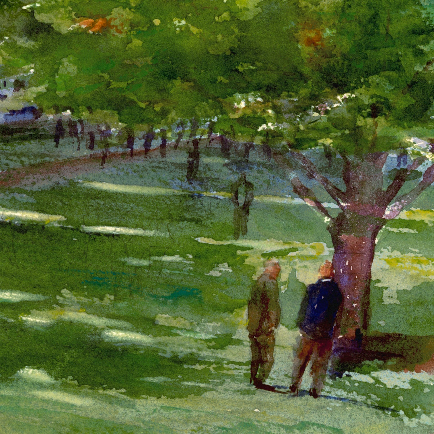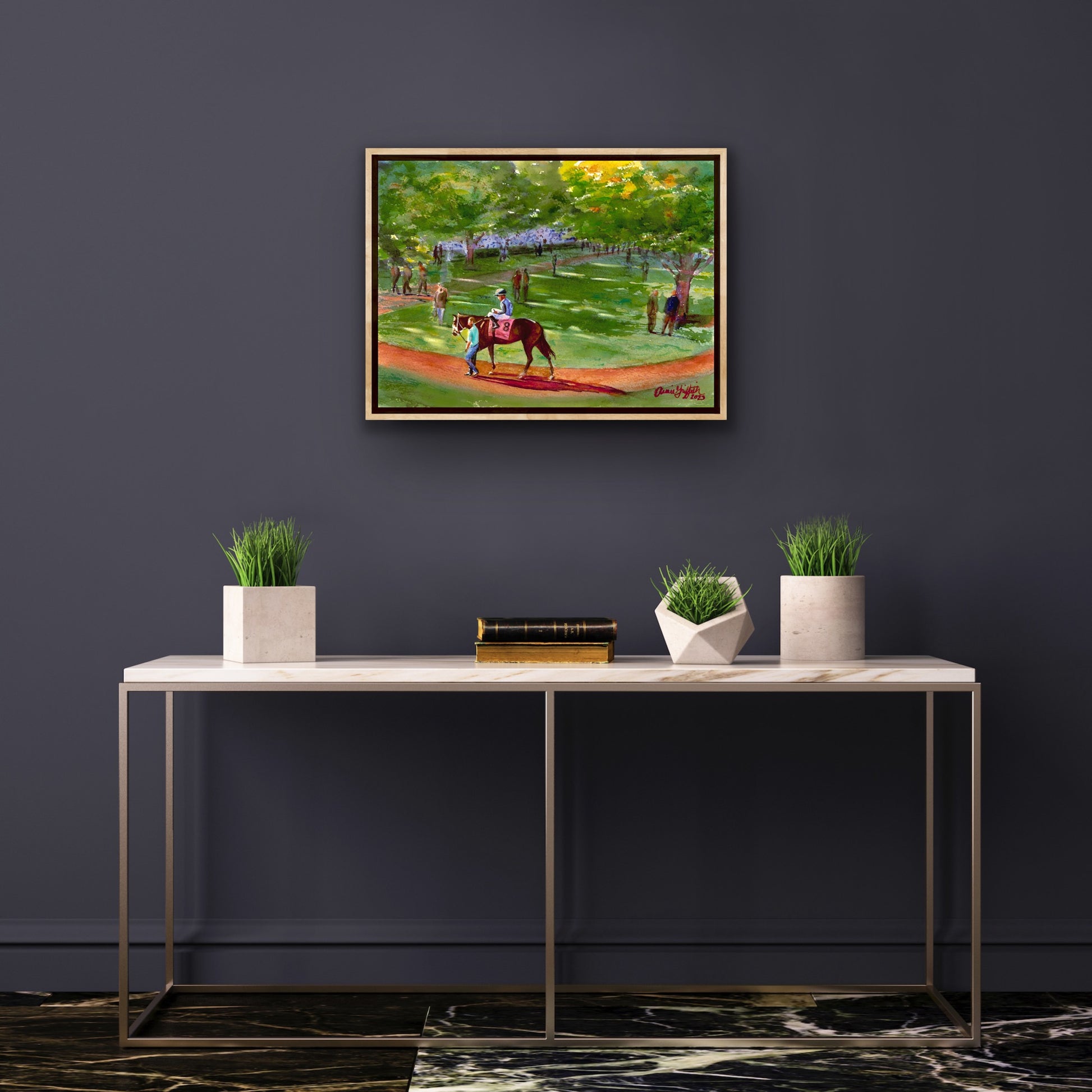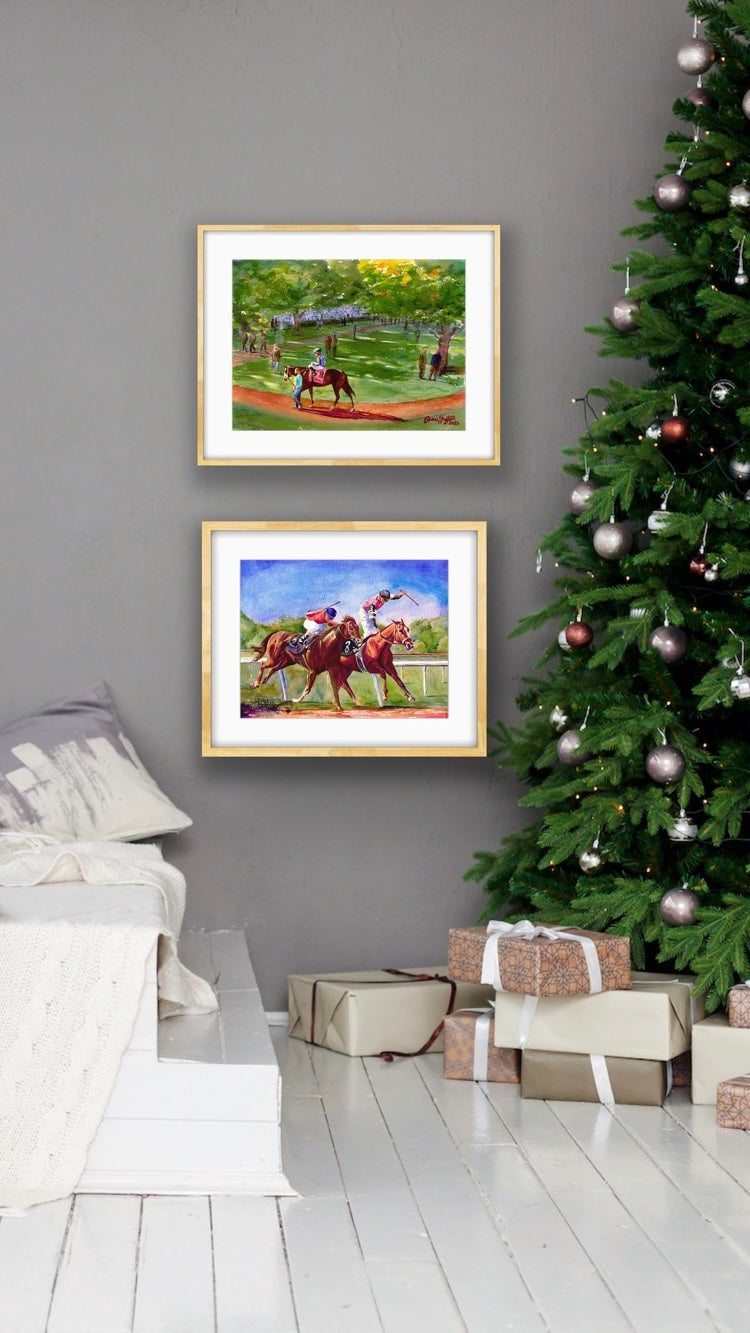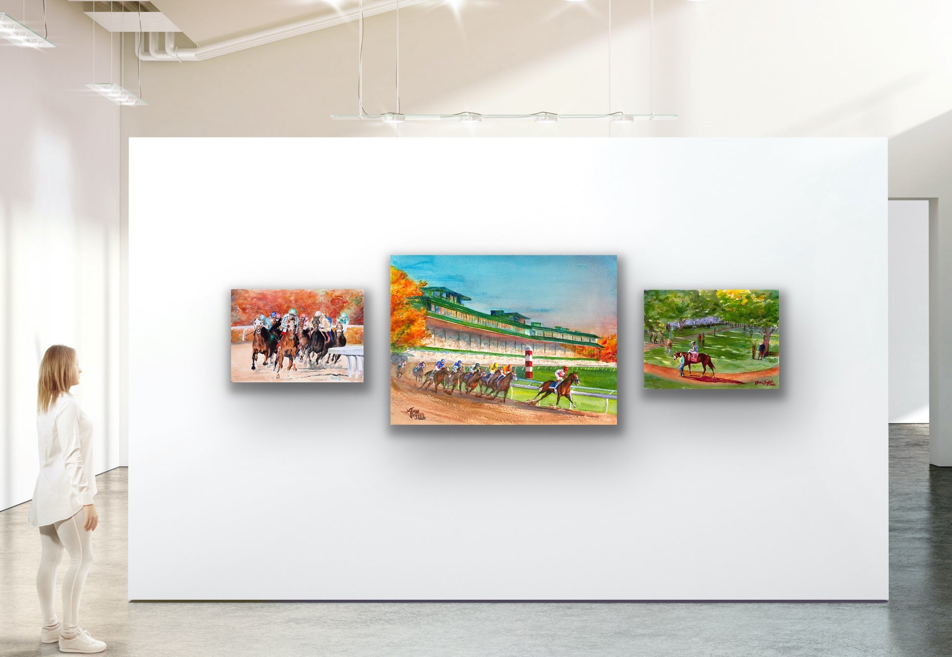 This is a professional quality giclee print of original watercolor painting of the horses and jockeys making last minute preparations, getting ready to walk onto the Keeneland racetrack in Lexington, KY during the most beautiful season in Kentucky, autumn.
